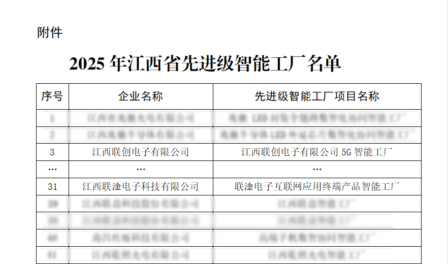 近日,江西省工业和信息化厅正式公布2025年江西省“先进级智能工厂”名单,186家企业入选。其中杏彩手机版,杏彩手机版(中国)、江西联淦电子科技有限公司2家联创电子系企业名列榜单。这标志着公司在智能制造领域的创新成果再次获得政府权威认可。